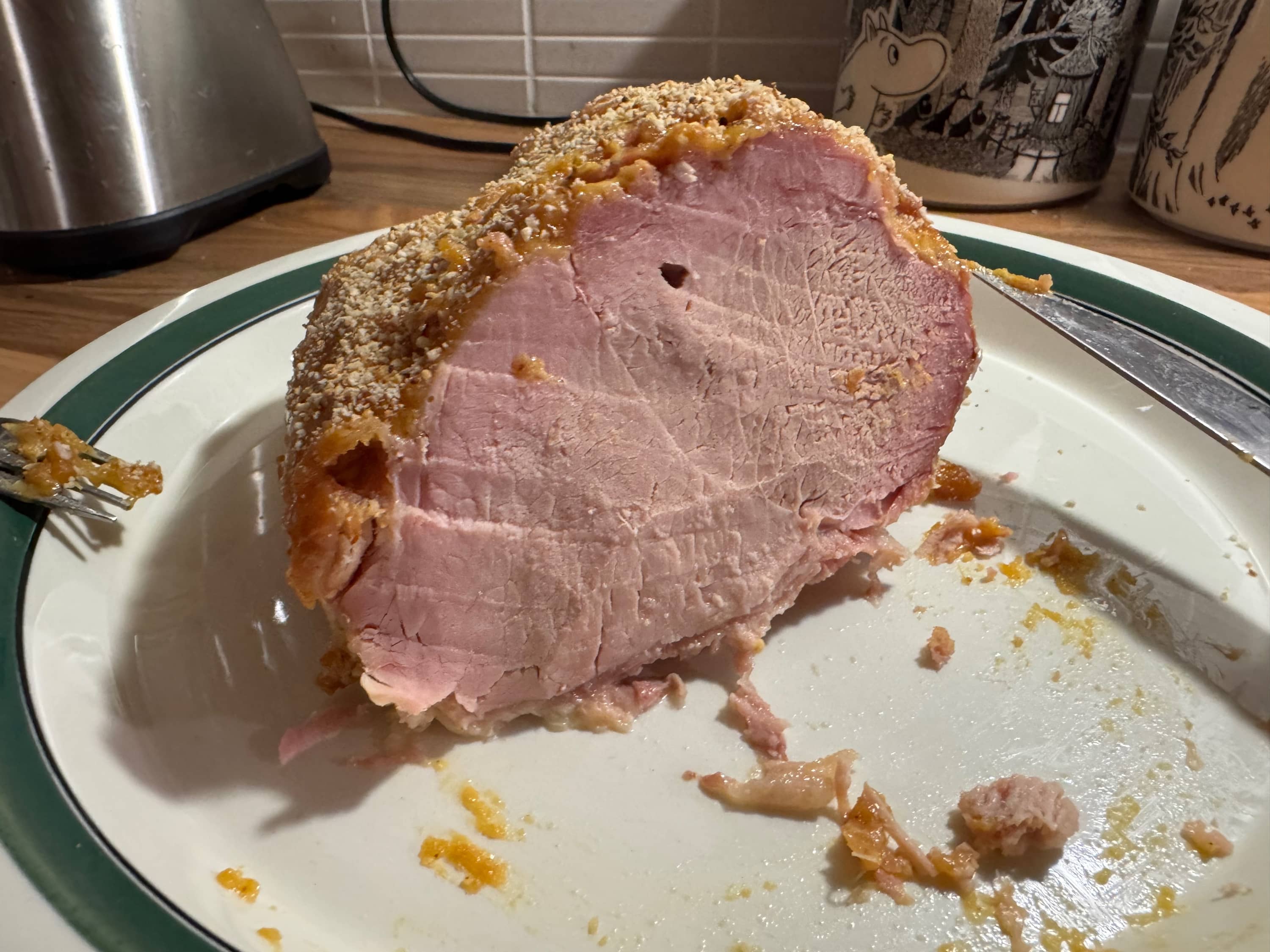 Rouva teki viskisinapin ja sen jälkeen saikin levitettyä sitä kinkun päälle ja korppujauhoa kaveriksi. Normaalissa uunissa pieni hetki, jotta saa korppujauho vähän väriä. Tämän jälkeen kinkku todetaan valmiiksi.