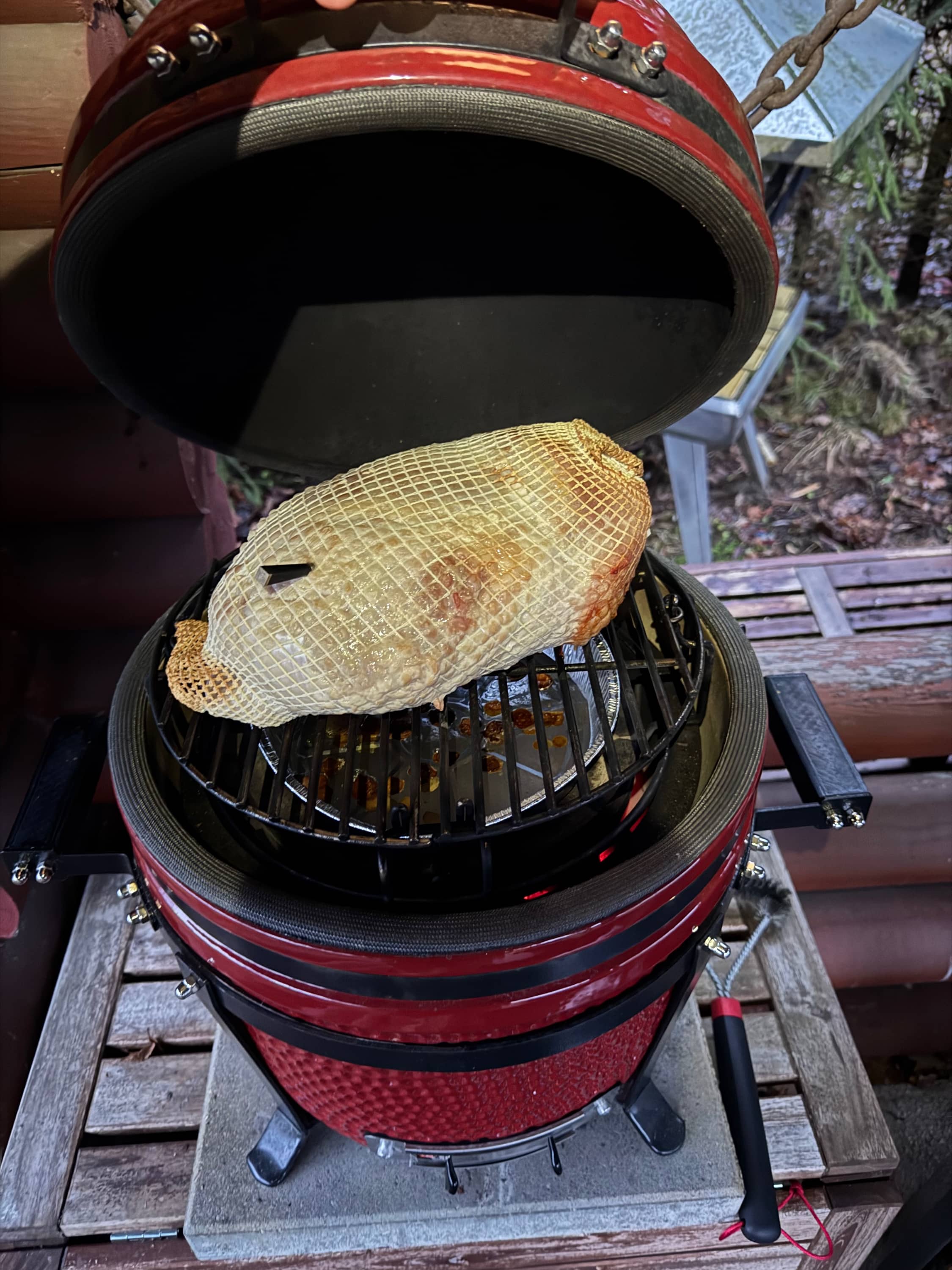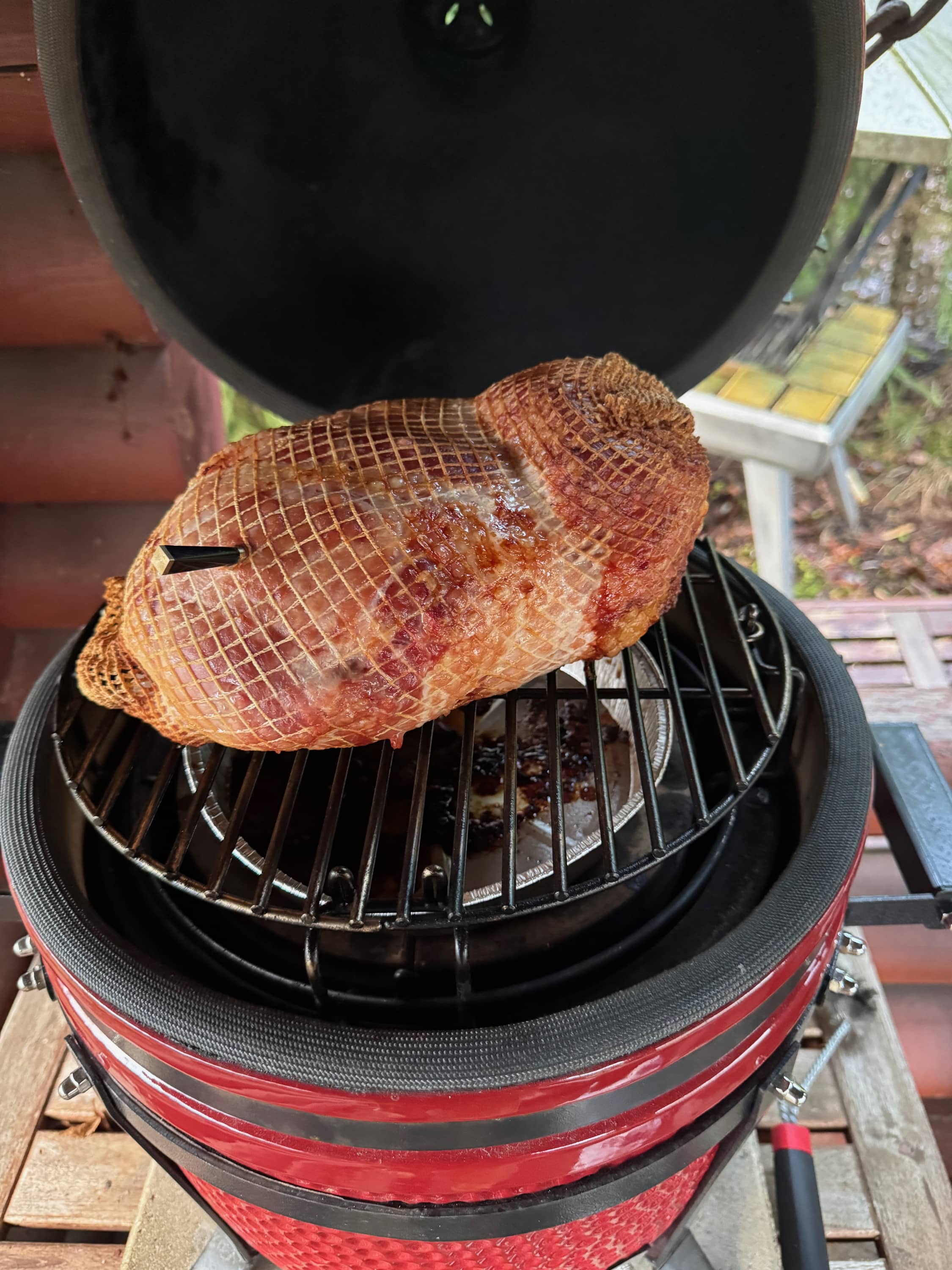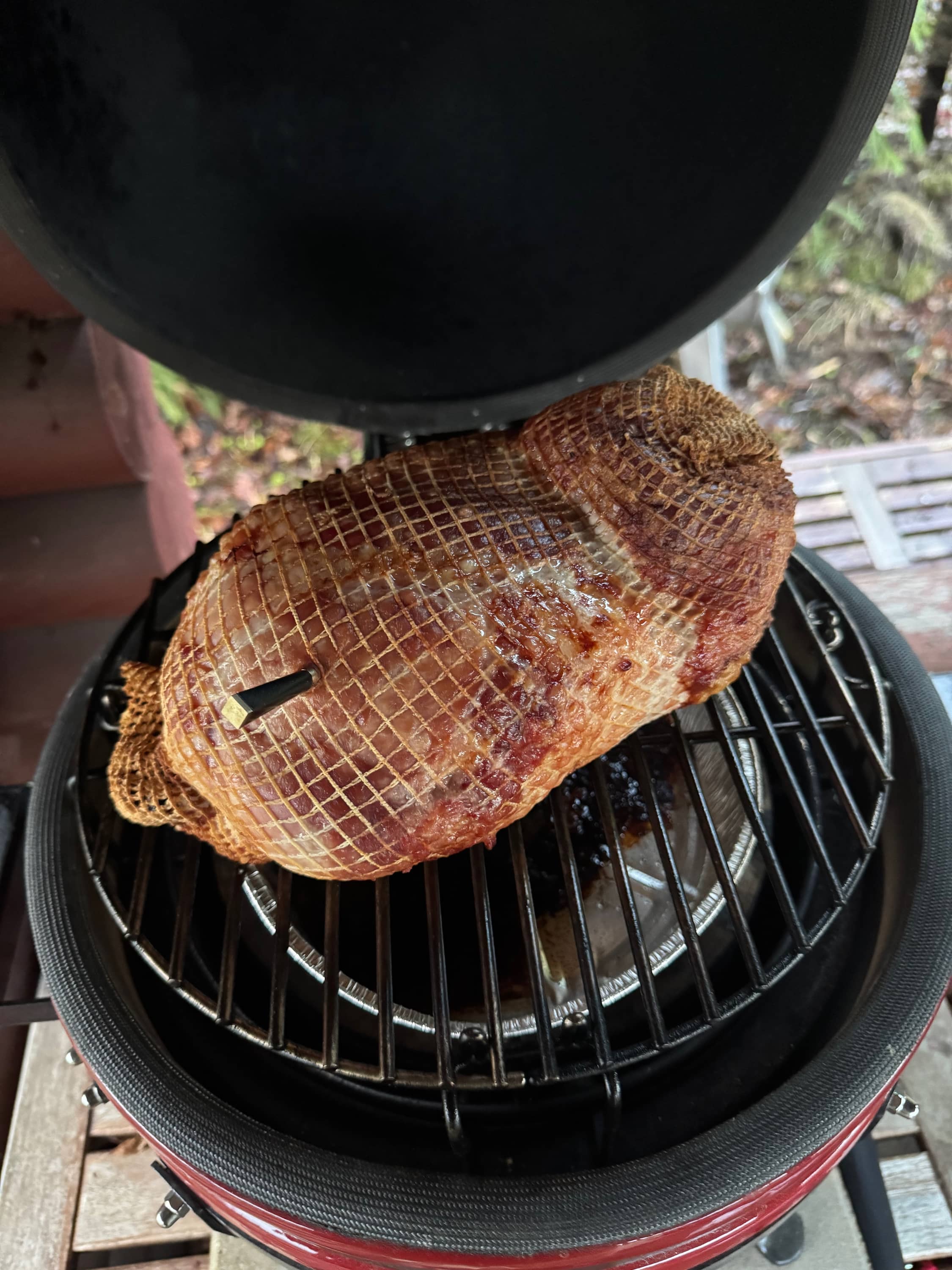 Kinkku paistui pääasiassa itsestään. Se hyvä puoli kamadossa on, että kun lämmön saa säädettyä kohdilleen niin se jaksaa puurtaa siellä itsestään. Kovapuuhiiliäkään ei kulu paljoa ja lämpö kun on mieto (110-130 välissä) niin pikku kamado täydellä hiilipesällä jaksaa helposti koko päivän.