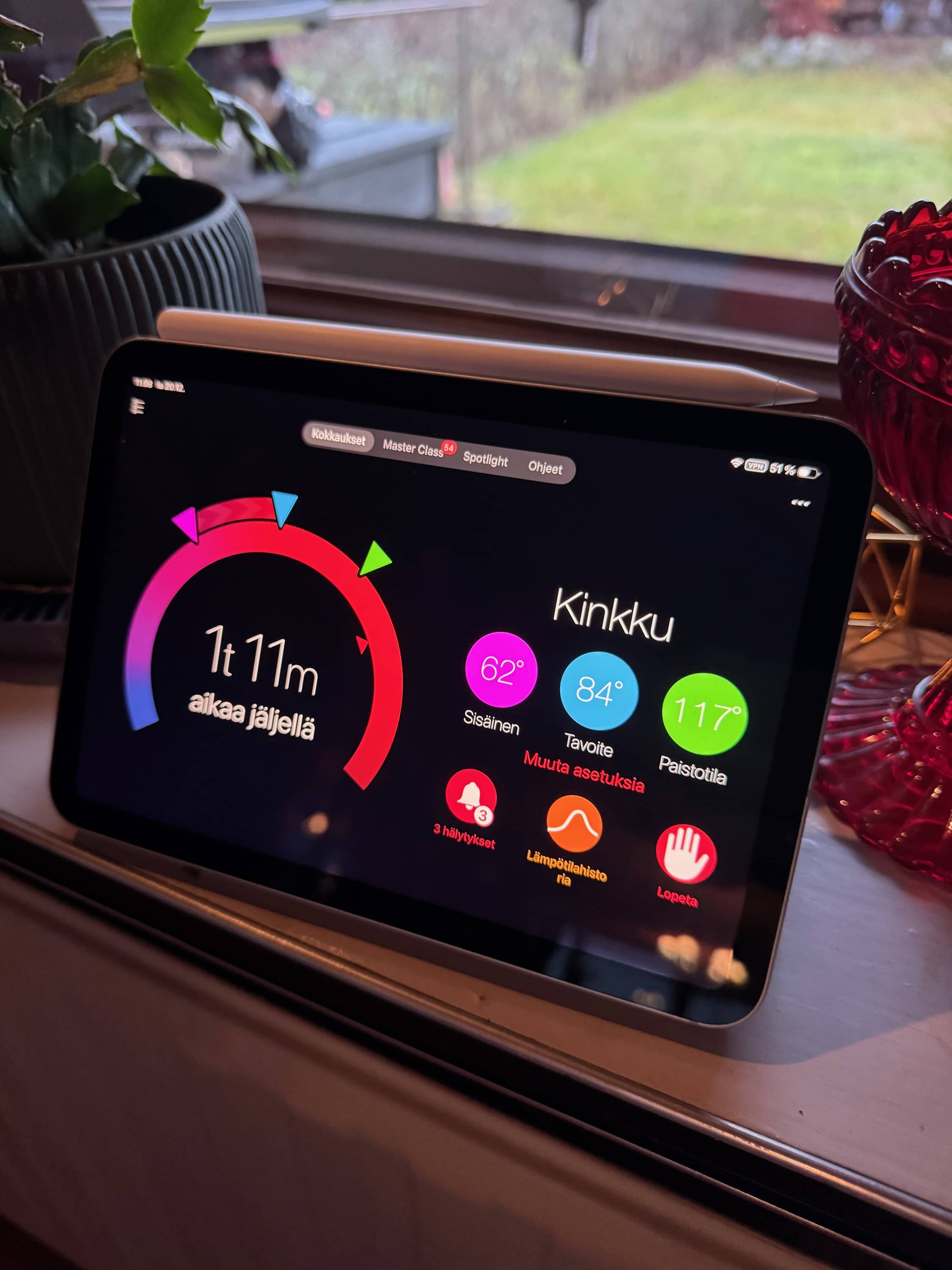 Alla onkin kuvaa kannen aukaisusta ja iPadin sijainnista. Tuossa on myös kiva bonus sillä Meaterin app pysyy auki ja näkee myös ohi kulkiessa mikä tilanne.