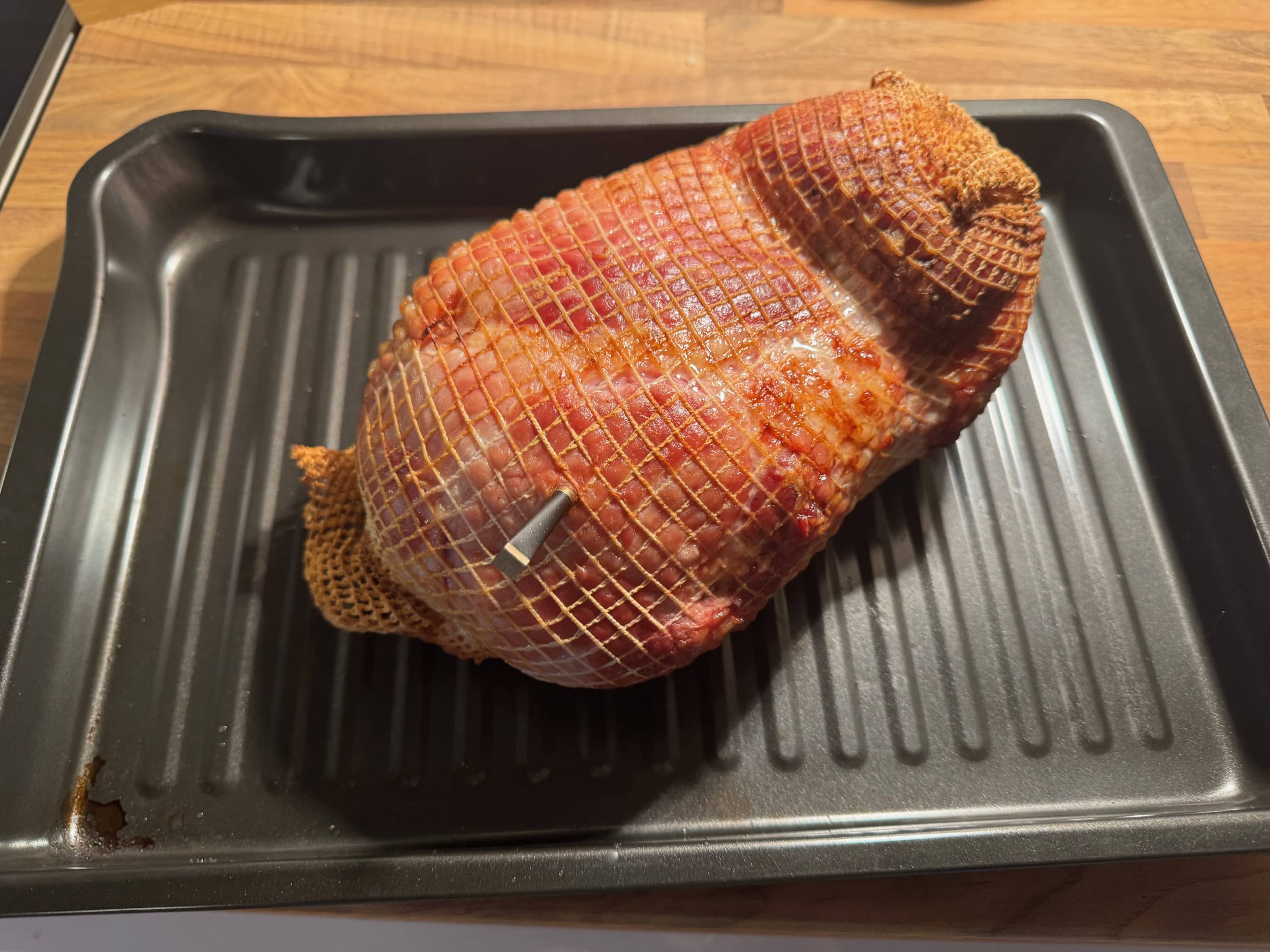 Ennen kamadoon laittoa kuivasin vain kinkun ja tökkäsin Meaterin kiinni. En alkanut maustamaan tai suolaamaan kinkkua lisää. Jätin verkonkin paikalleen niin pysyy kinkku ns. kasassa. Osa ottaa verkon pois, mutta tällöin kannattaa käsitellä kinkkua varovasti.