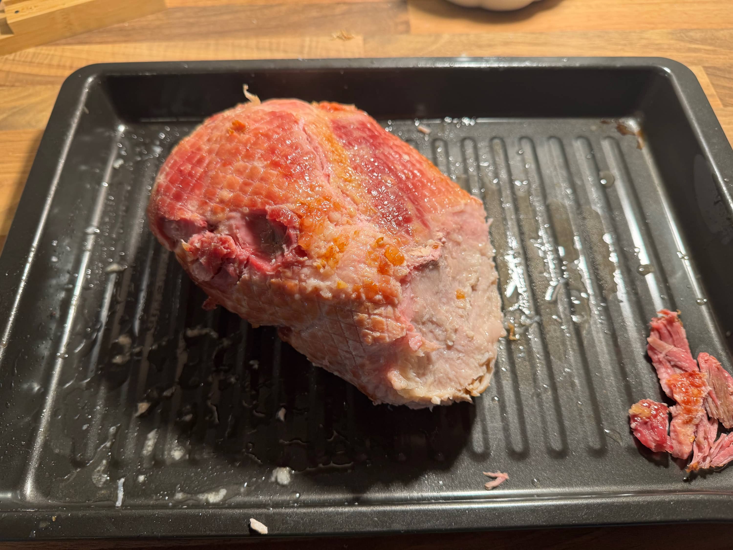 Sisälämpö kun näytti 82 niin päätin ottaa kinkun pois. Tällöin aikaa oli mennyt noin kuutisen tuntia ja kinkku oli saanut väriäkin. Otin kinkun sisälle ja sitten nappasin verkon ja nahat (sekä päällä olleet rasvat) pois. Tämän jälkeen pistin folion päälle ja jätin odottamaan sinappihuntua.
