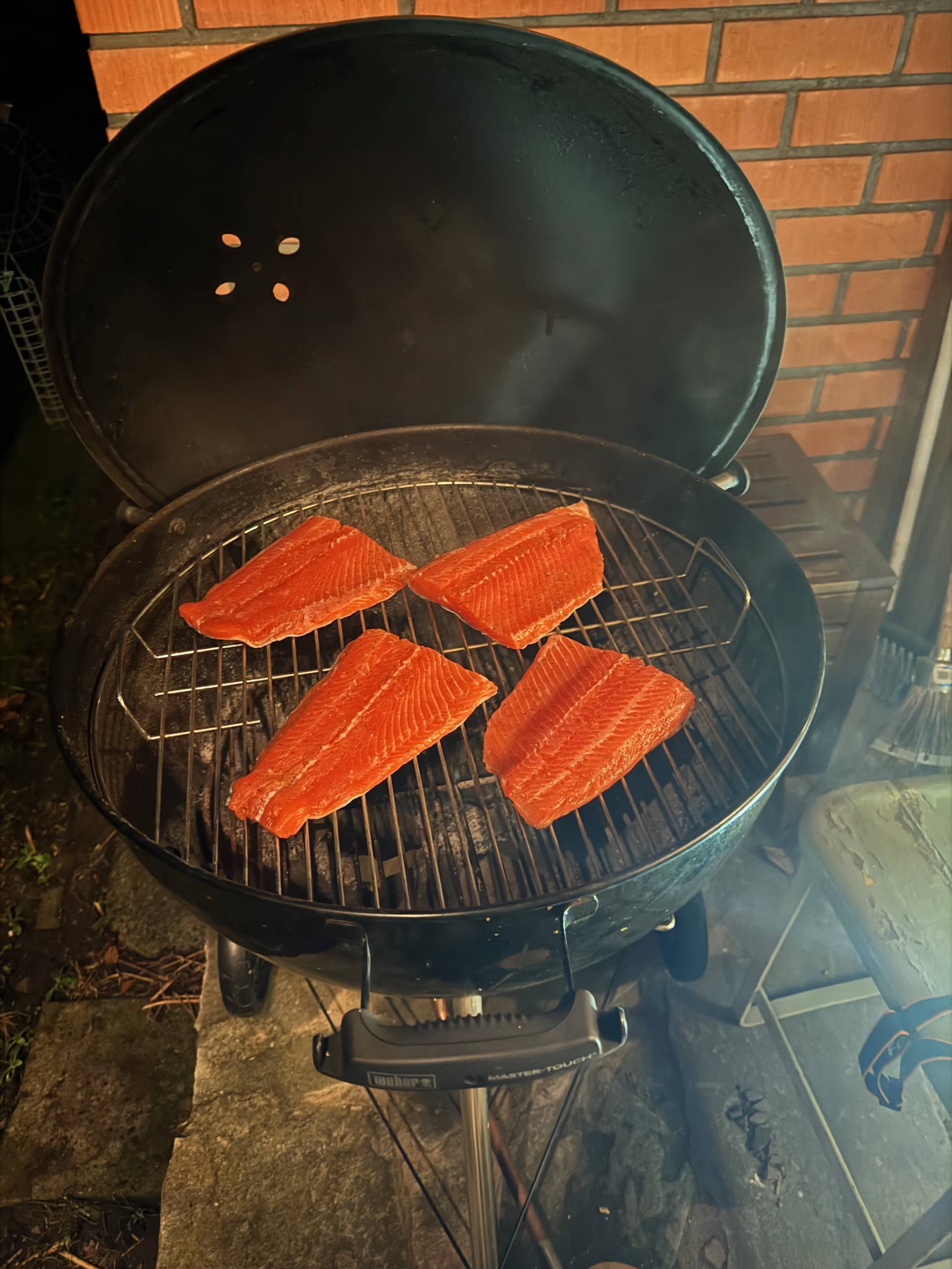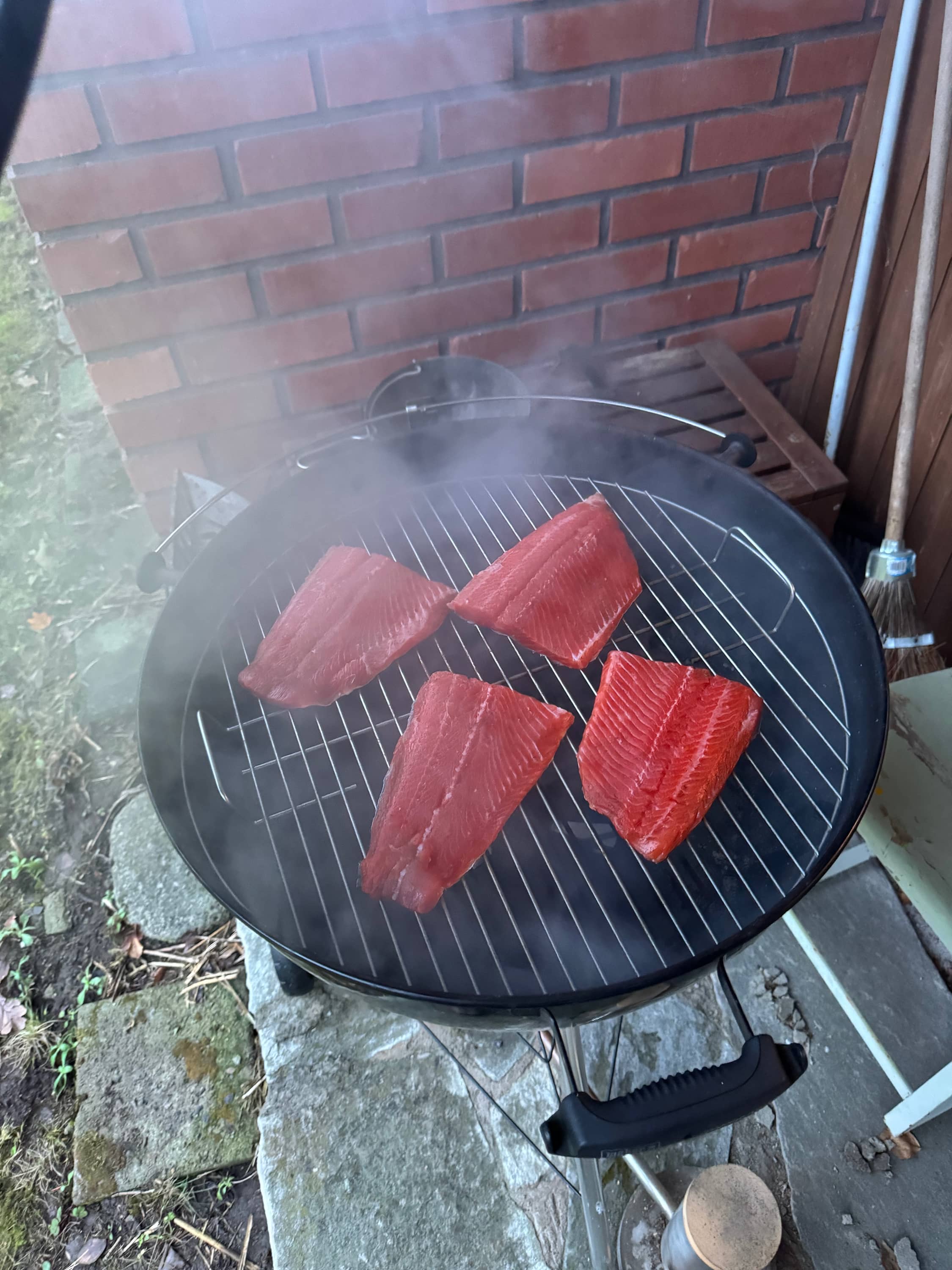 Seuraavana aamuna sitten aletaan kylmäsavustamaan. Käyttöön otetaan blogissakin aiemmin nähty Mustan savukehitin ja Weberin pallogrilli. Itsellä on pikkuinen putki savukehittimestä pallogrilliin ja näin kalat saa savua. Olen vielä oman ritilän hankkinut Biltemasta kaloja varten. Olisi vielä pari filettä mahtunut, mutta näillä mennään.
