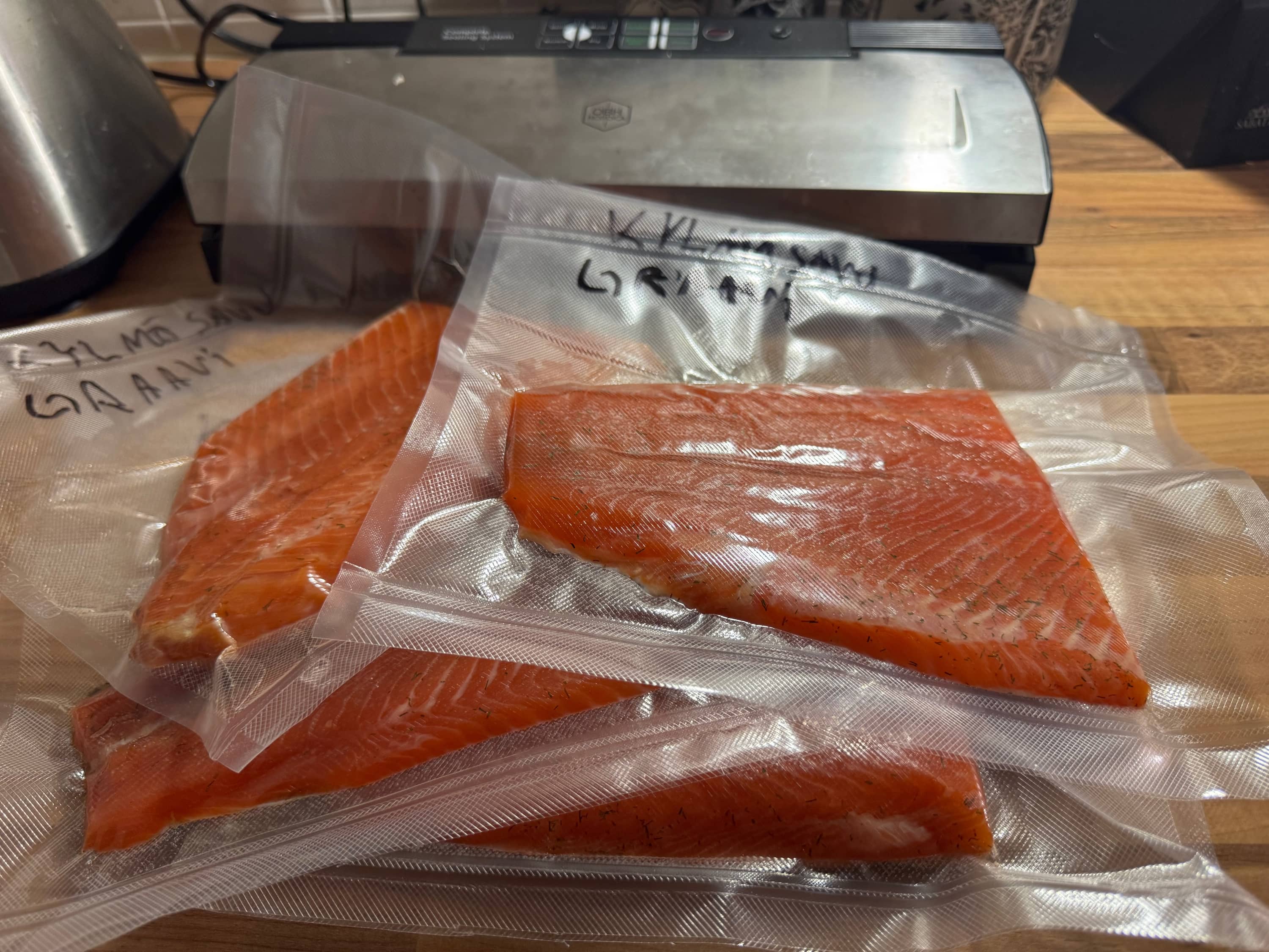 Kalat oli kylmäsavussa reilu 10 tuntia ja sen jälkeen otin ne pois ja pistin vakuumiin. Kalat saa olla vakuumissa jääkaapissa pari päivää ennen syömistä, jotta maku tasaantuu. Tai oikeastaan niin kauan kuin malttaa olla syömättä. Pienen maistiaisen otin ja olihan se hyvää.