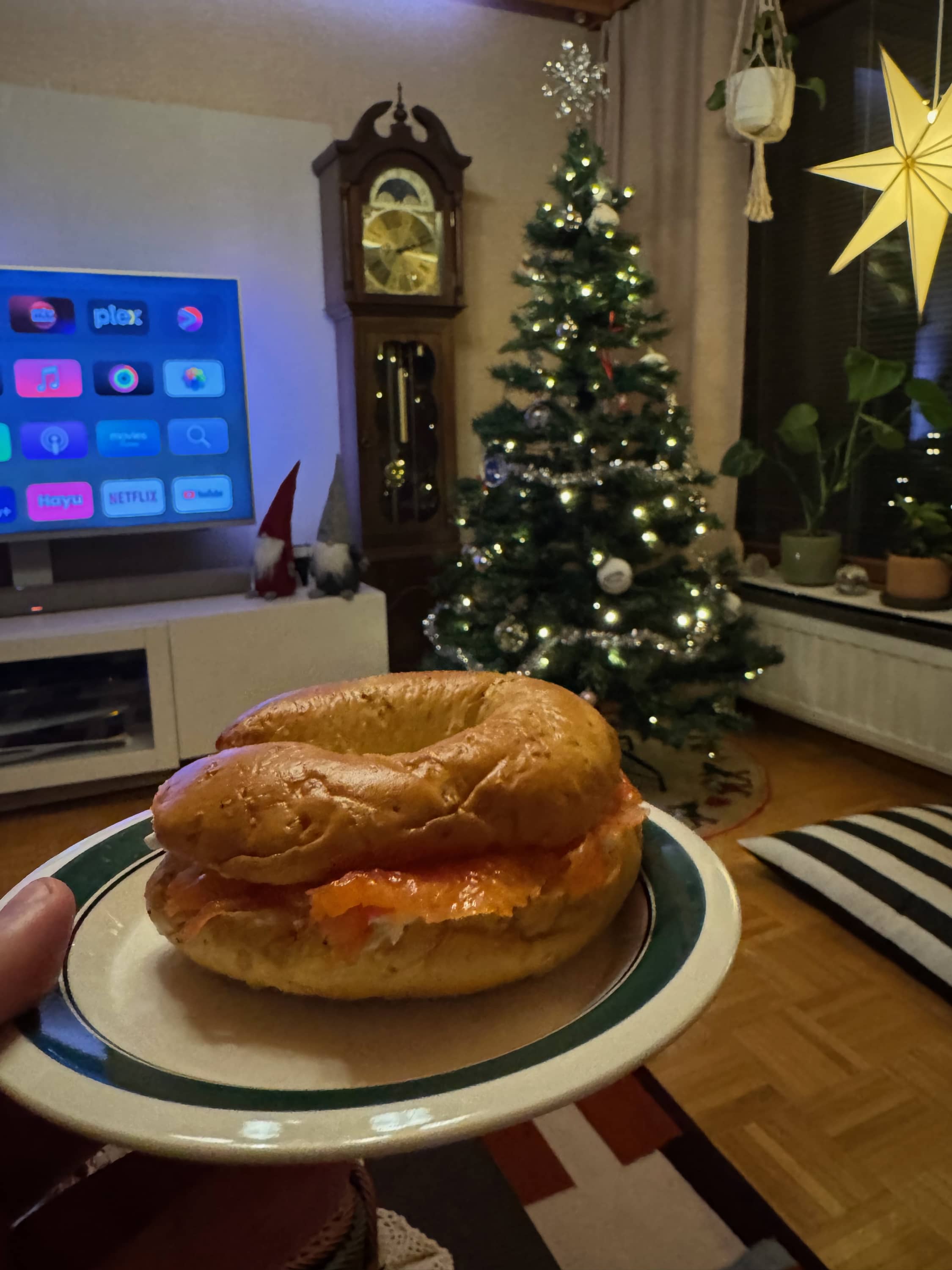 Pitihän tuota päästä jo illalla maistamaan. Rinkelisämpylä paahtimeen, tuorejuustoa ja graavia. Tohon kun olisi ollut vielä pikkelöityä punasipulia tai mummonkurkkuja niin olisi ollut vielä hitusen parempi.